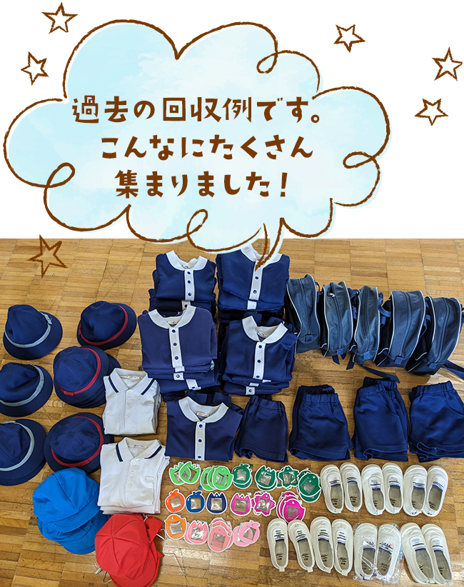 【回収品目】 紺色上着、長袖ポロ、半袖ポロ、ランニング、Tシャツ、半ズボン、赤白帽、青白帽、通園帽(赤・グレー)、上靴、名札、かばん ※お手数ですが、必ず洗濯後のお品をご提供ください。 ※元のお名前が判らない様、予め名前の部分は消していただくか、切り取って下さい。