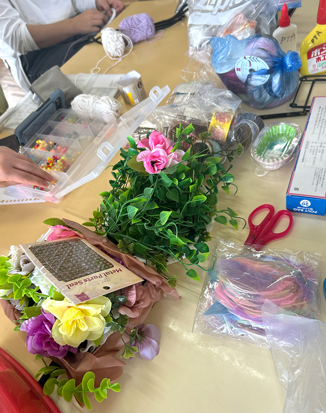 枠に毛糸をどんどん巻き付けていきます。毛糸が絡まったりとハプニングもありましたが(笑)没頭できる貴重な集中タイムでした! 枠に毛糸を巻き終えたら、装飾をしていきます。ビーズやフェザーなどを母の会、当日もご用意しております。他にも装飾したいものがある方は、ぜひご持参ください☆