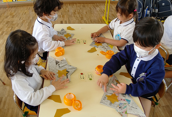 りんご組は新聞紙で折ったかぶとに、色画用紙で飾り付けをしていました。